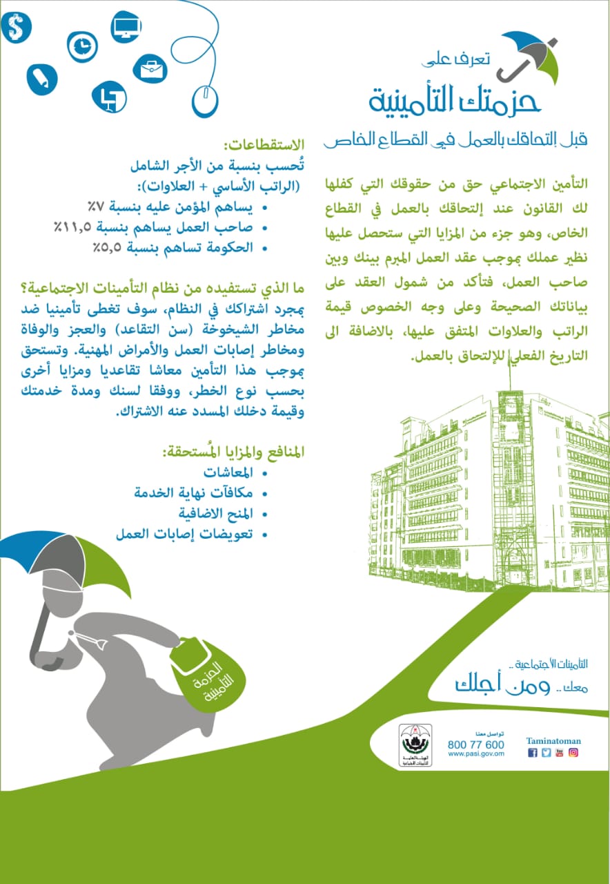 6:04 taminatkw 11 194 просмотра. ضيف في كثير من البرامج التلفزيونية. انا كنت مسجل في التأمينات ومره واحده الصفحه اتقفلت وحاولت الدخول بدون جادوه وفي رساله بأن الرقم ليس مرتبط بأي حساب ماذا افعل. هيئة التأمينات الاجتماعية سلطنة عُمان. «نظمت #التأمينات_الاجتماعية بالتعاون مع شركة تنمية نفط عمان و الشركة الوطنية العمانية للهندسة…» اما السعوديين تدفع الشركة لهم نسبة% من الراتب. طريقة حساب مبلغ التأمينات الاجتماعية سلطنة عمان. تقدم إلى مدرسات في سلطنة عمان، لمقهى في سلطنة عمان نادلات المغرب، بسلطنة عمان محاميين ومحاميات والمزيد! اجرءات اسقاط تابع من التأمينات الاجتماعية حيث يمكن للجميع الاستعلام عن التأمينات الاجتماعية من خلال رقم الهوية أو السجل المدني، و هي من الخدمات المميزة والسهلة التي تقدمها التأمينات الاجتماعية عبر موقعها الرسمي، وذلك لتوفير الجهد والوقت للجميع. ويتم ذلك عن طريق الدخول إلى الموقع الرسمي للهيئة العامة للتأمينات الاجتماعية، واختيار خيار المنافع، والذي سينتقل إلى صفحة جديدة يتم من خلالها ملء المعلومات التي يطلبها النظام وهي: التأمينات الاجتماعية و أستقبال المتقاعدين. تشغيل وضع قابل للوصول بشكل أفضل. قيمة التامينات تكون 20 % من الراتب المسجل فى التأمينات يتحمل منه 9 نسبه التأمينات الاجتماعية للوافدين2% مخاطر عمل وهذه لا تخصم علي العامل.